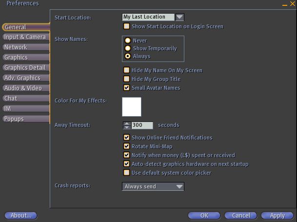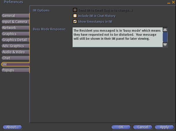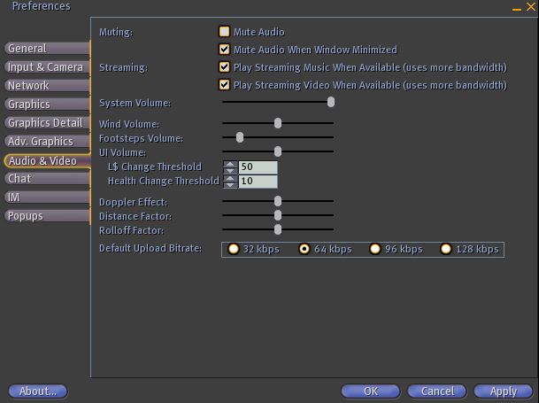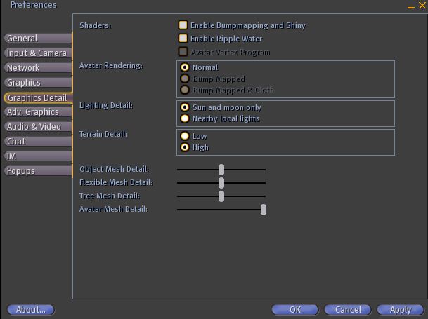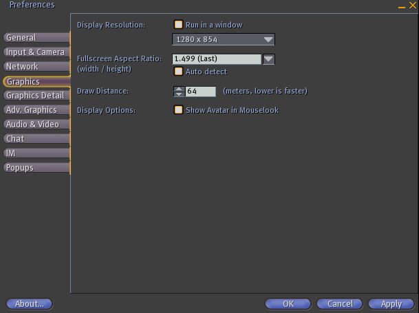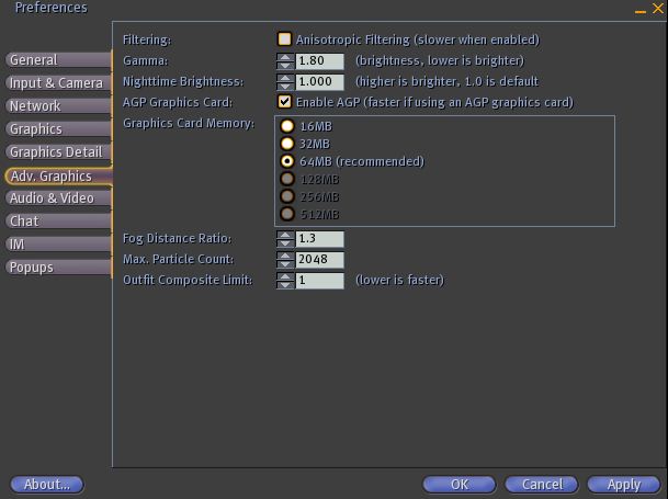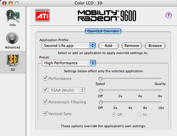 You can also optimize graphics performance by downloading ATi Displays app if you have a Mac with an ATi graphics card like most of the PowerBook/iBook series. Set Second Life.app to High Performance. DO NOT UTILIZE THE OTHER FEATURES AS SOME LIKE THE ROTATE COMMAND WILL LOCK-UP YOUR DISPLAY FORCING YOU TO REINSTALL MAC OSX. |